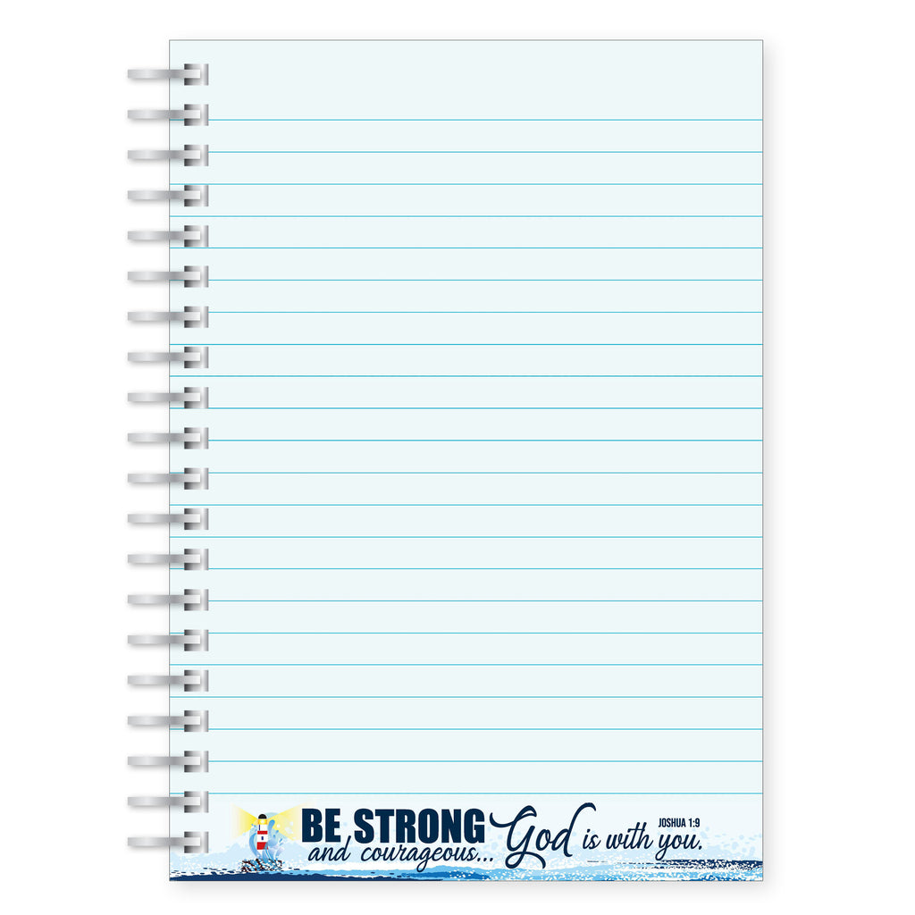 - Bible verse or wording on bottom of each page: ‘Be strong and courageous… God is with you.’ Joshua 1:9
